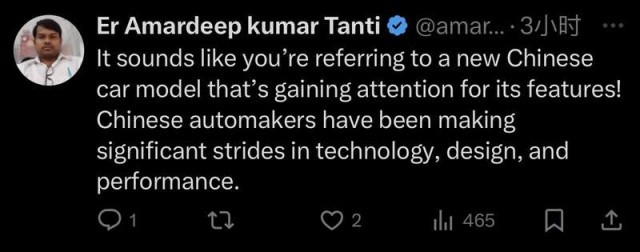一名网友则点评:中国汽车制造商在技术、设计和性能方面取得了重大进步。